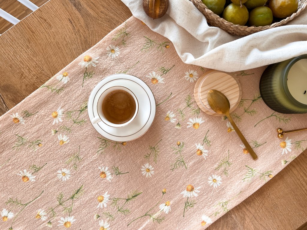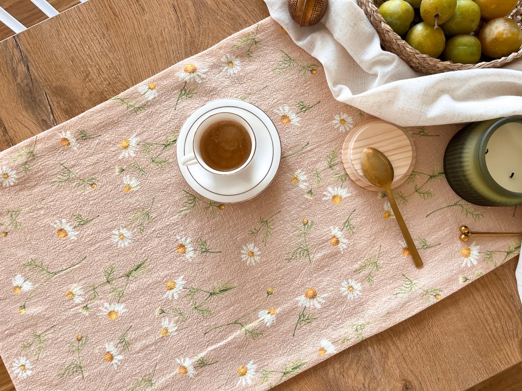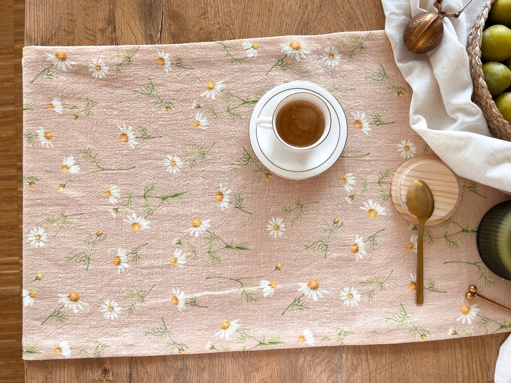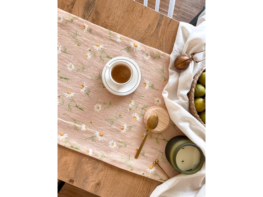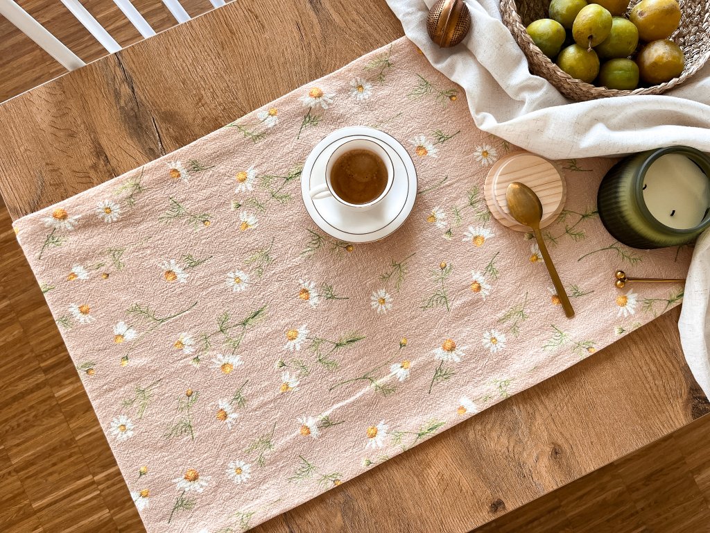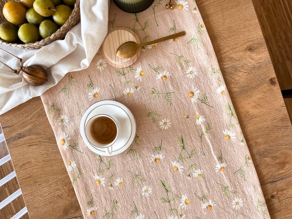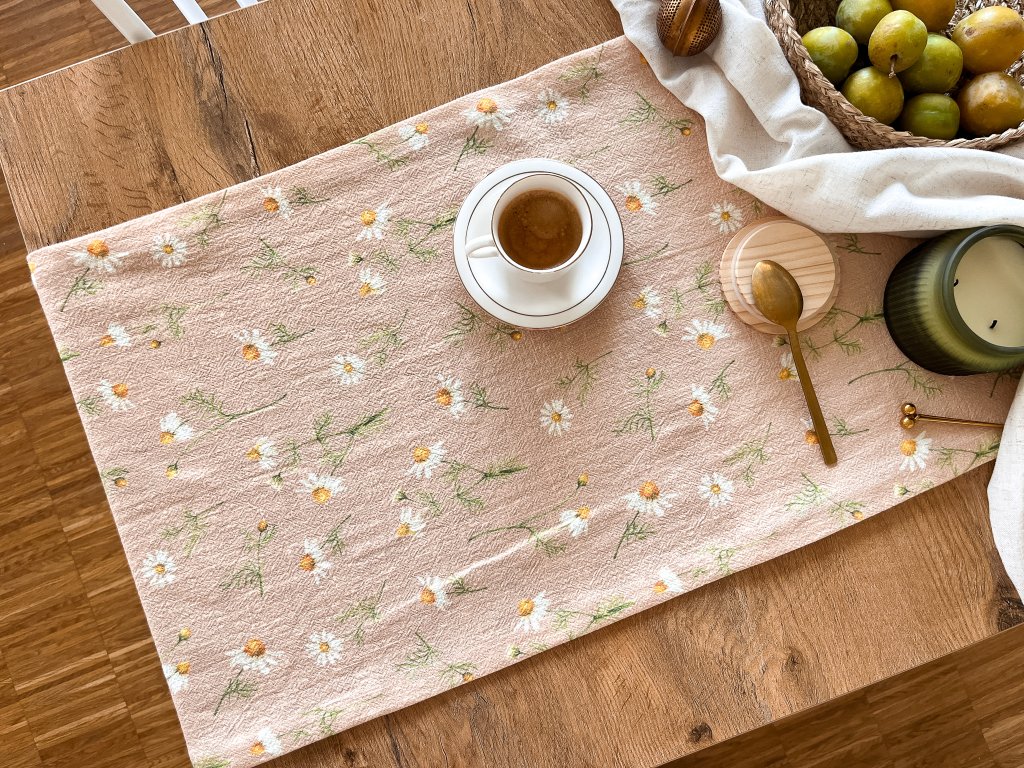 Lněný, udržitelný, funkční, neskutečně příjemný, jednoduše ach! To je lněný běhoun s autorskou akvarelovými ilustracemi heřmánku.