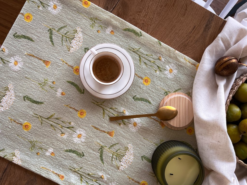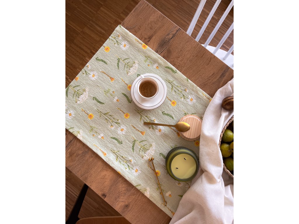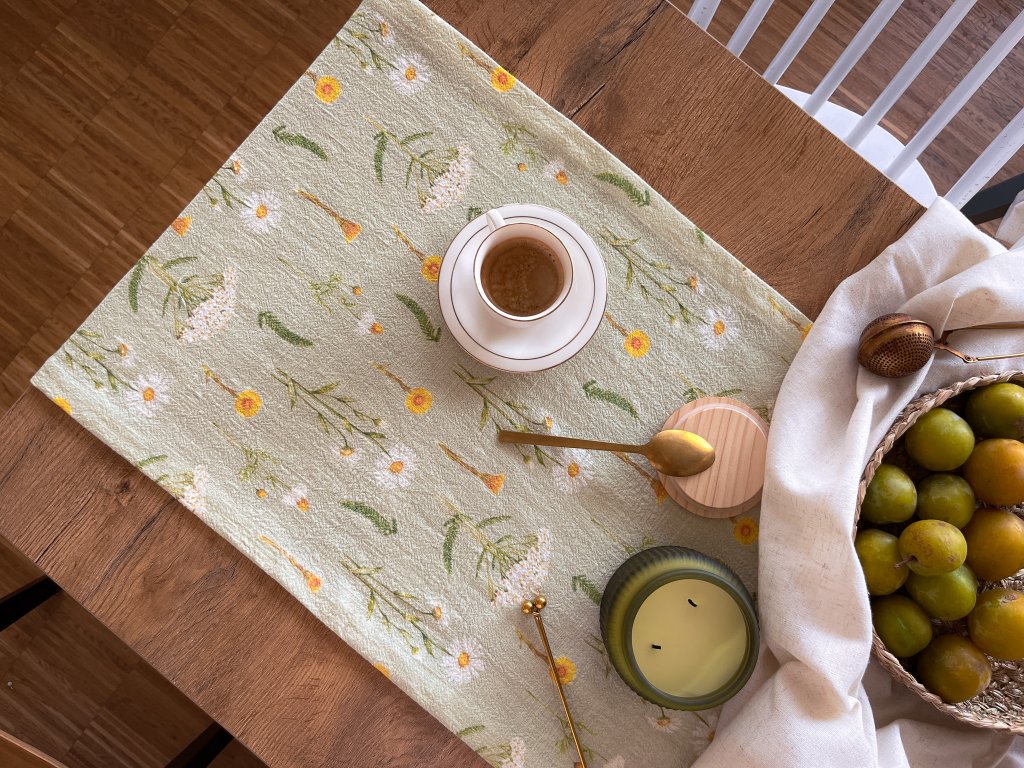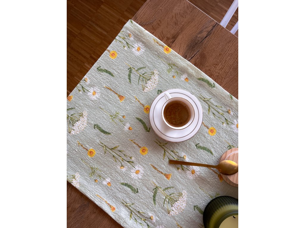 Lněný, udržitelný, funkční, neskutečně příjemný, jednoduše ach! To je lněný běhoun s autorskou akvarelovými ilustracemi podbělu, řebříčku, heřmánku a kopretin.