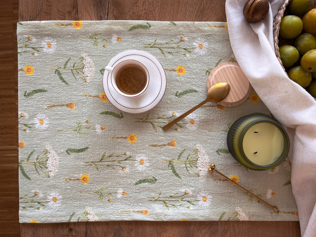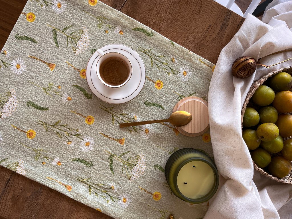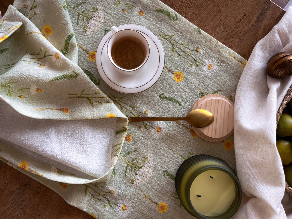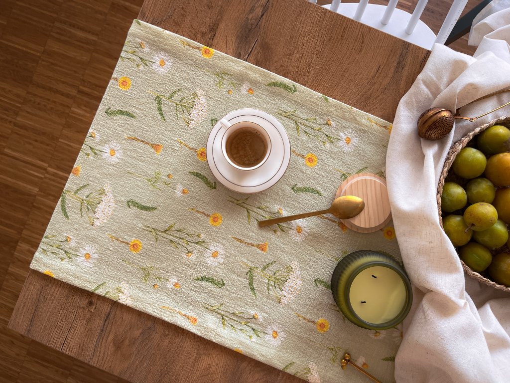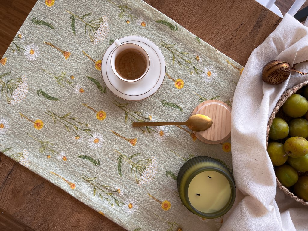 Lněný, udržitelný, funkční, neskutečně příjemný, jednoduše ach! To je lněný běhoun s autorskou akvarelovými ilustracemi podbělu, řebříčku, heřmánku a kopretin.