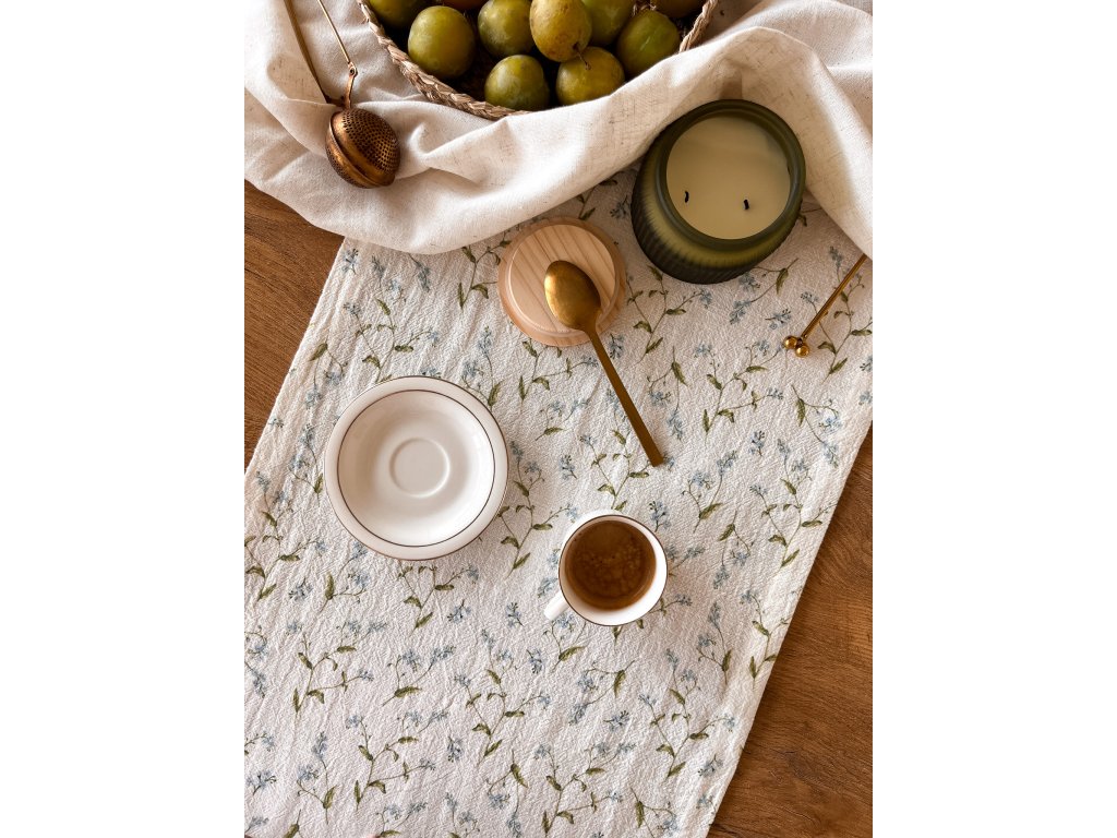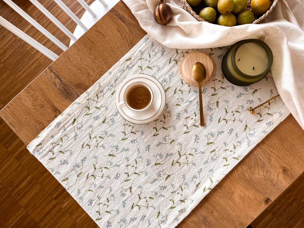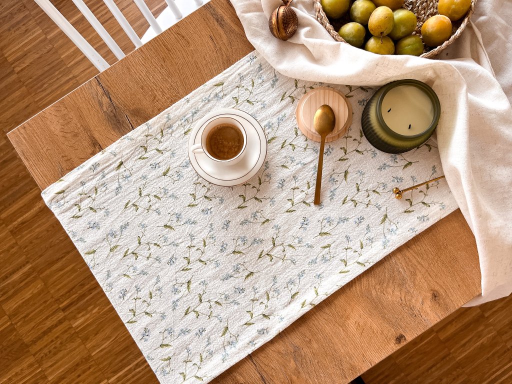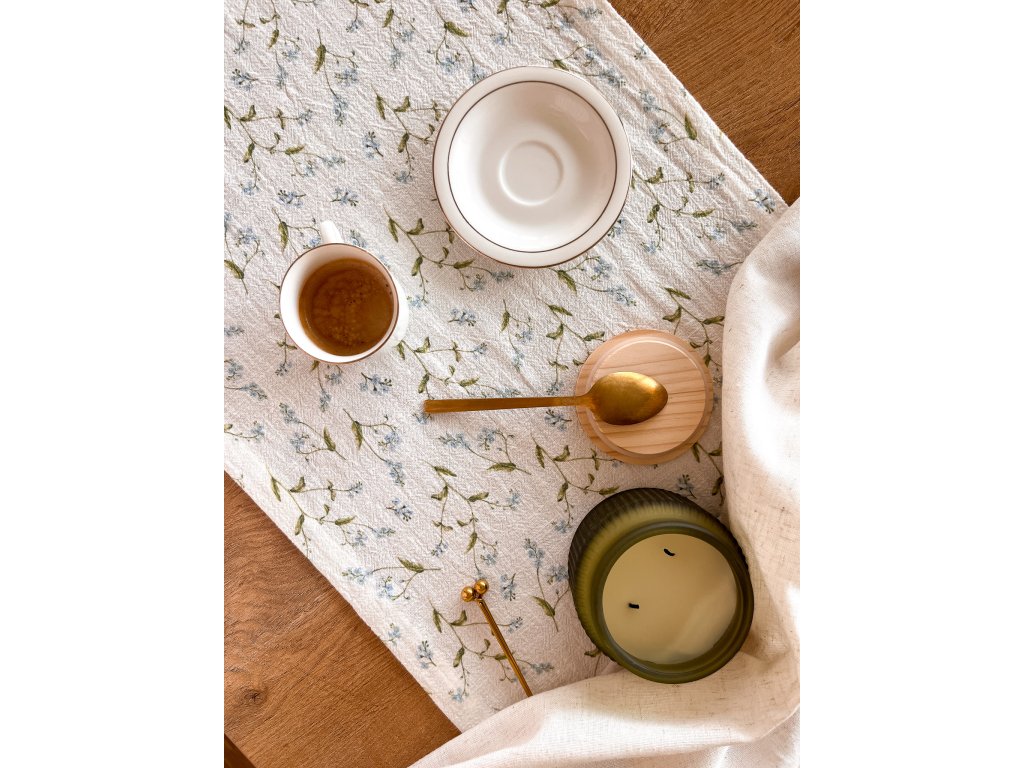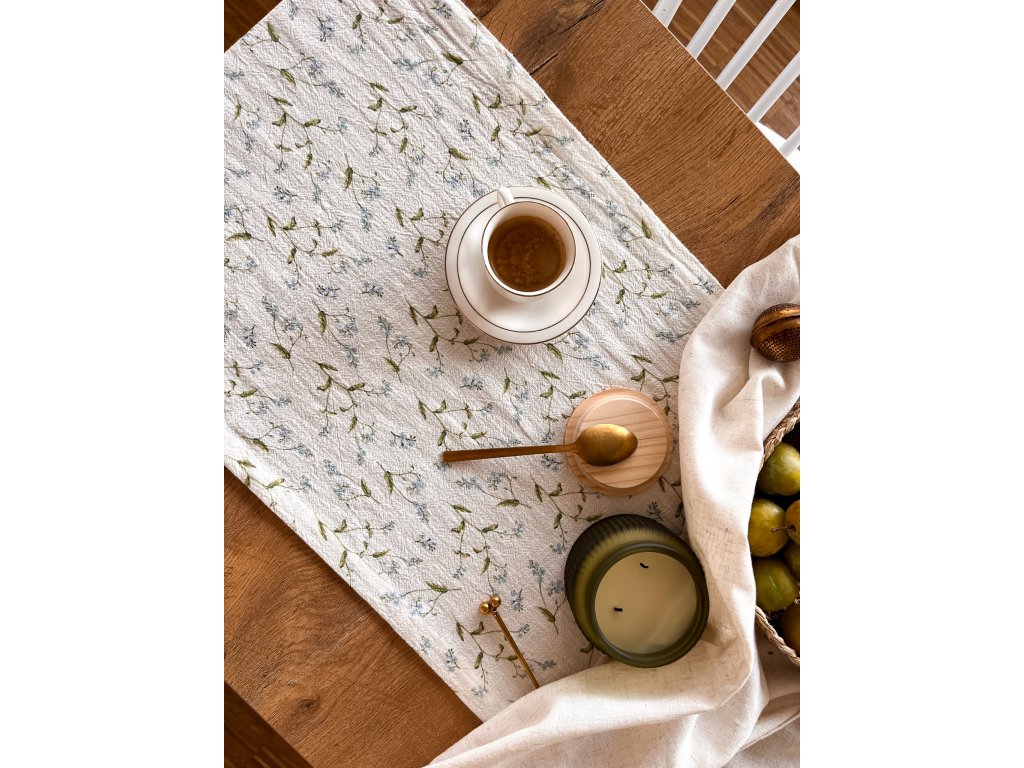 Lněný, udržitelný, funkční, neskutečně příjemný, jednoduše ach! To je lněný běhoun s autorskou akvarelovými ilustracemi pomněnek.
