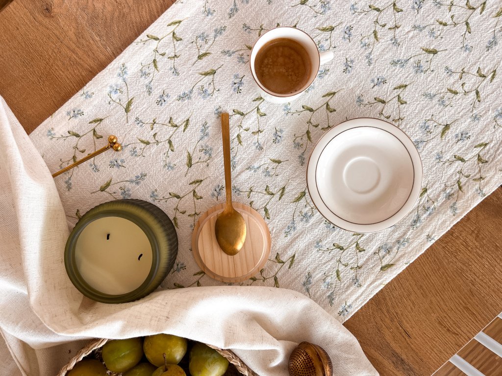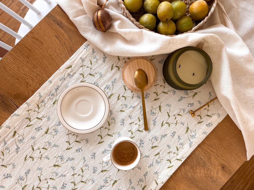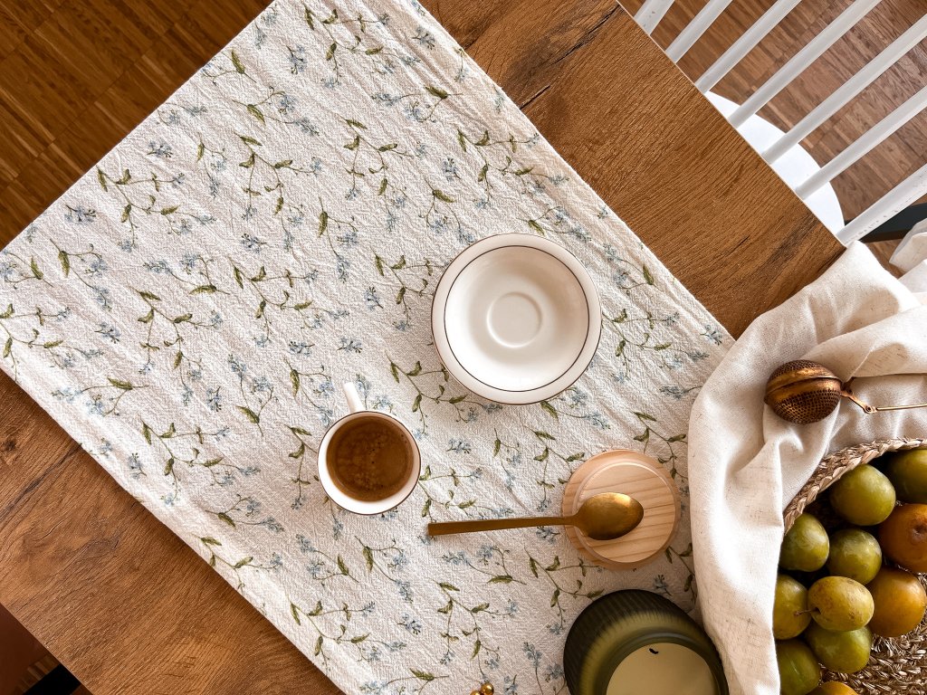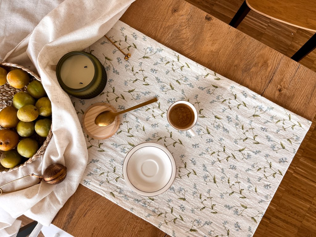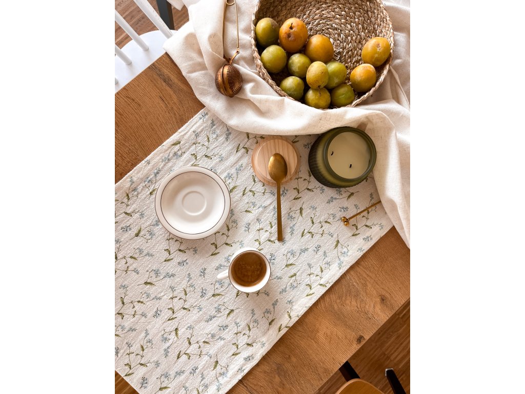 Lněný, udržitelný, funkční, neskutečně příjemný, jednoduše ach! To je lněný běhoun s autorskou akvarelovými ilustracemi pomněnek.