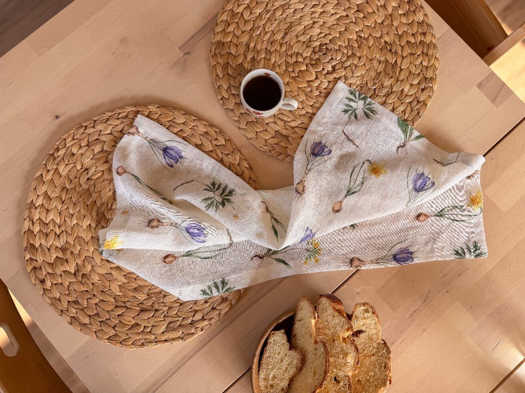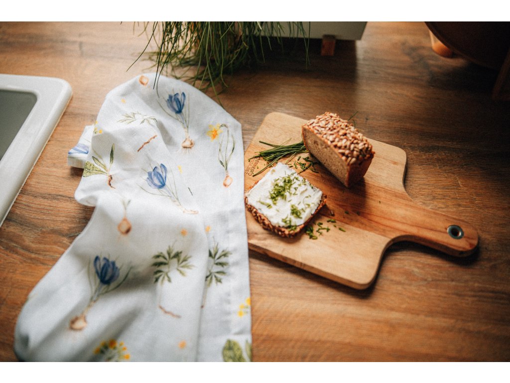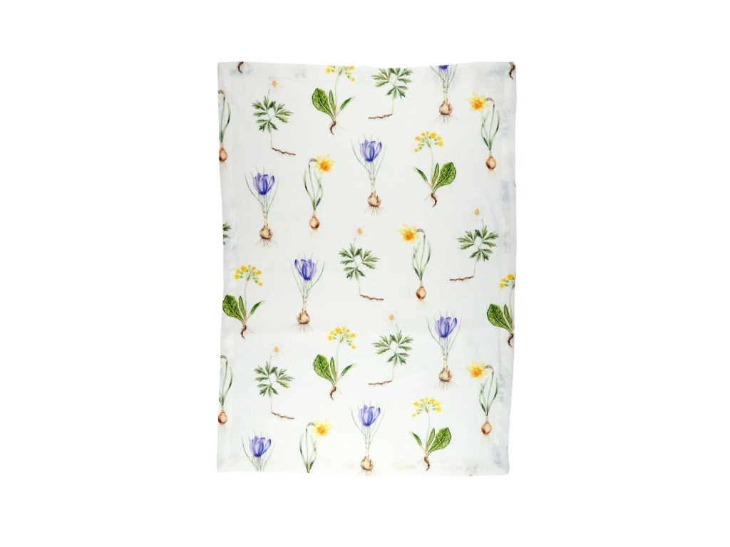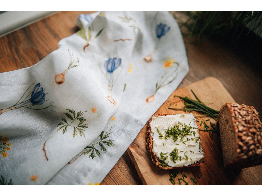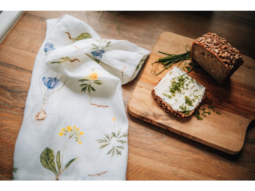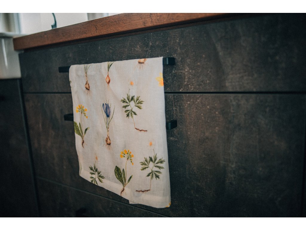 Lněná, udržitelná, funkční, neskutečně příjemná, jednoduše ach! To je lněná utěrka s autorskou akvarelovou ilustrací jarních herbářových ilustrací.