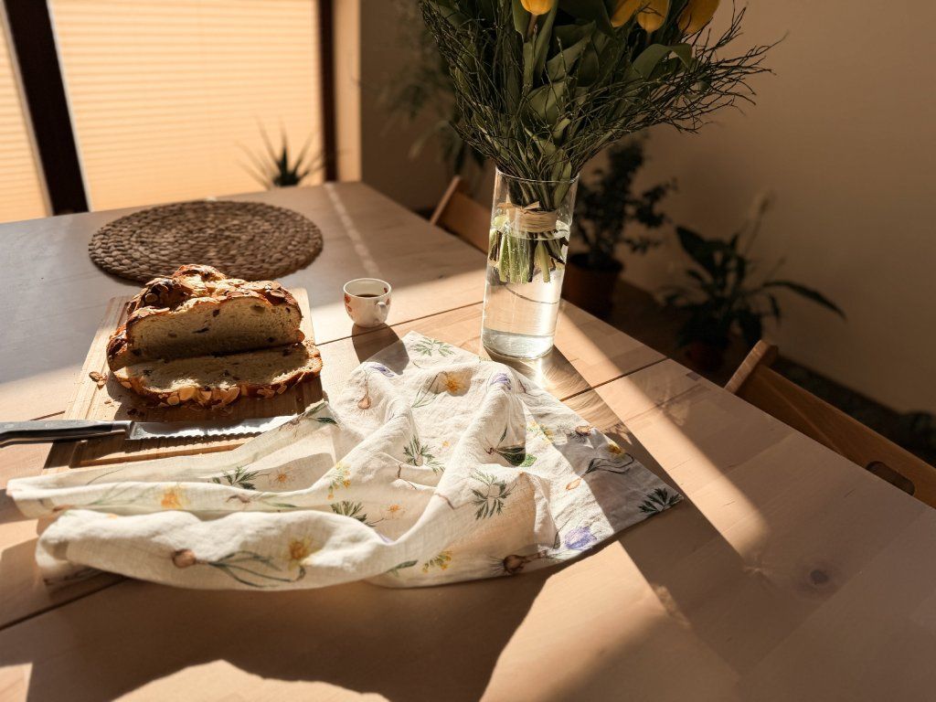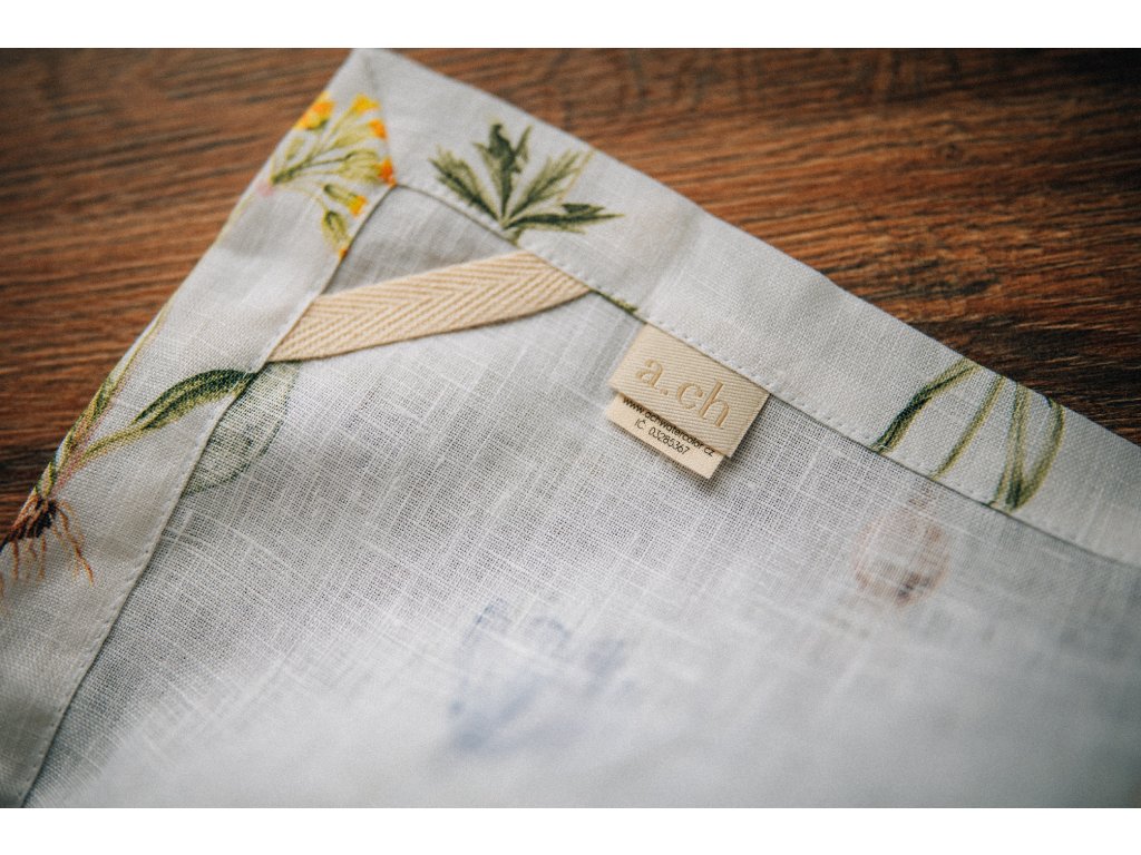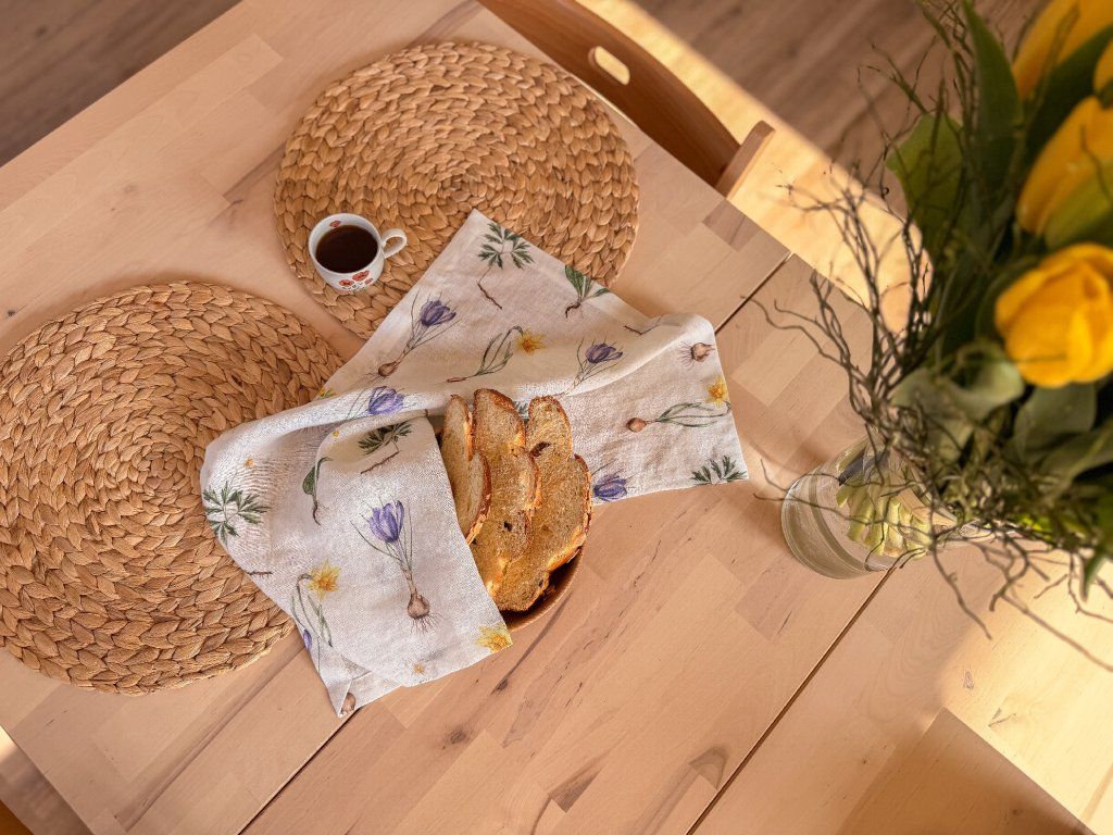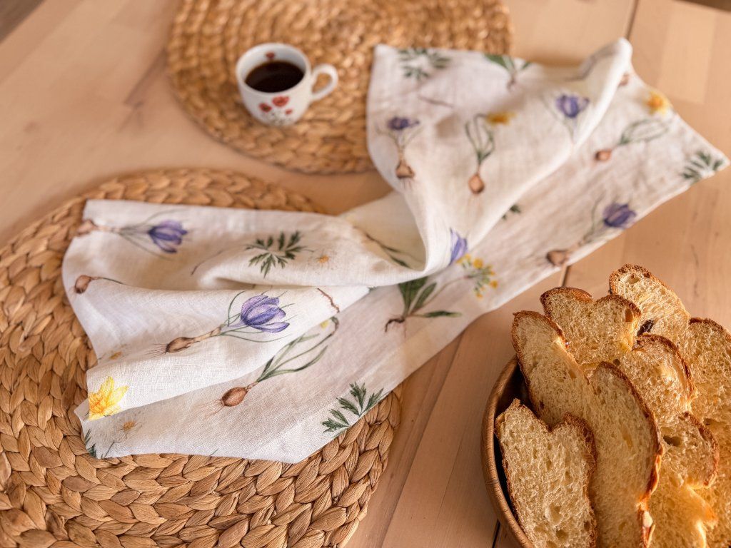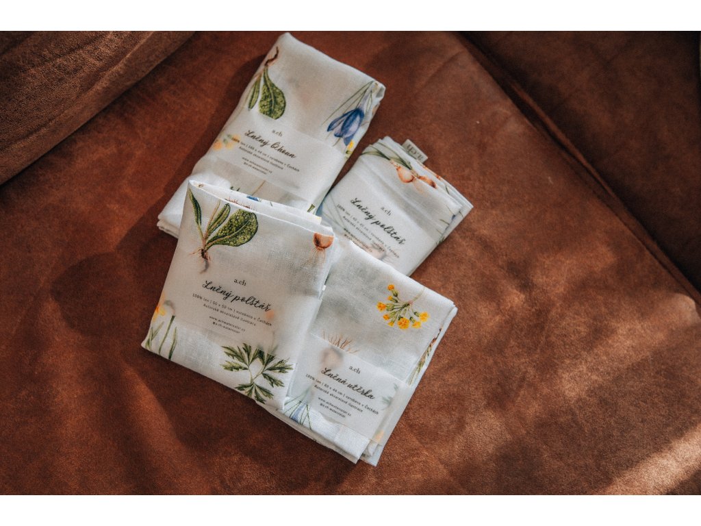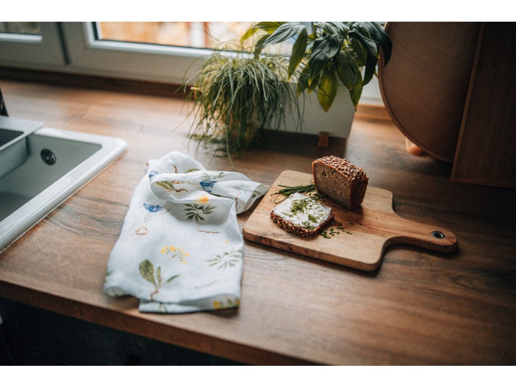 Lněná, udržitelná, funkční, neskutečně příjemná, jednoduše ach! To je lněná utěrka s autorskou akvarelovou ilustrací jarních herbářových ilustrací.