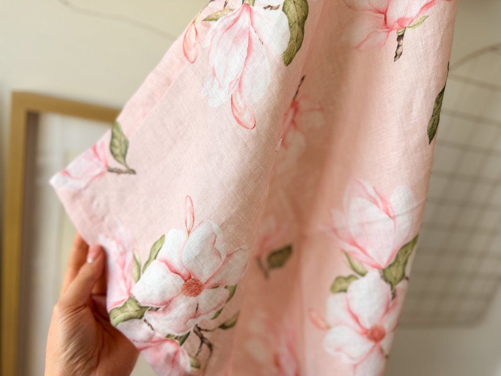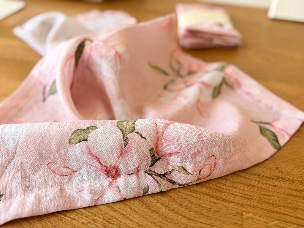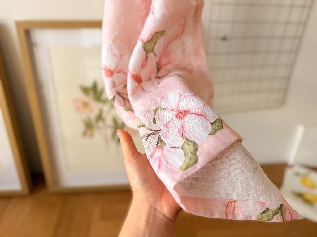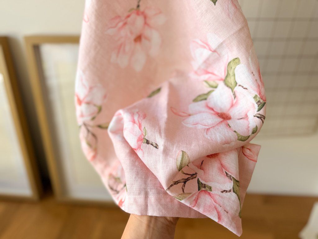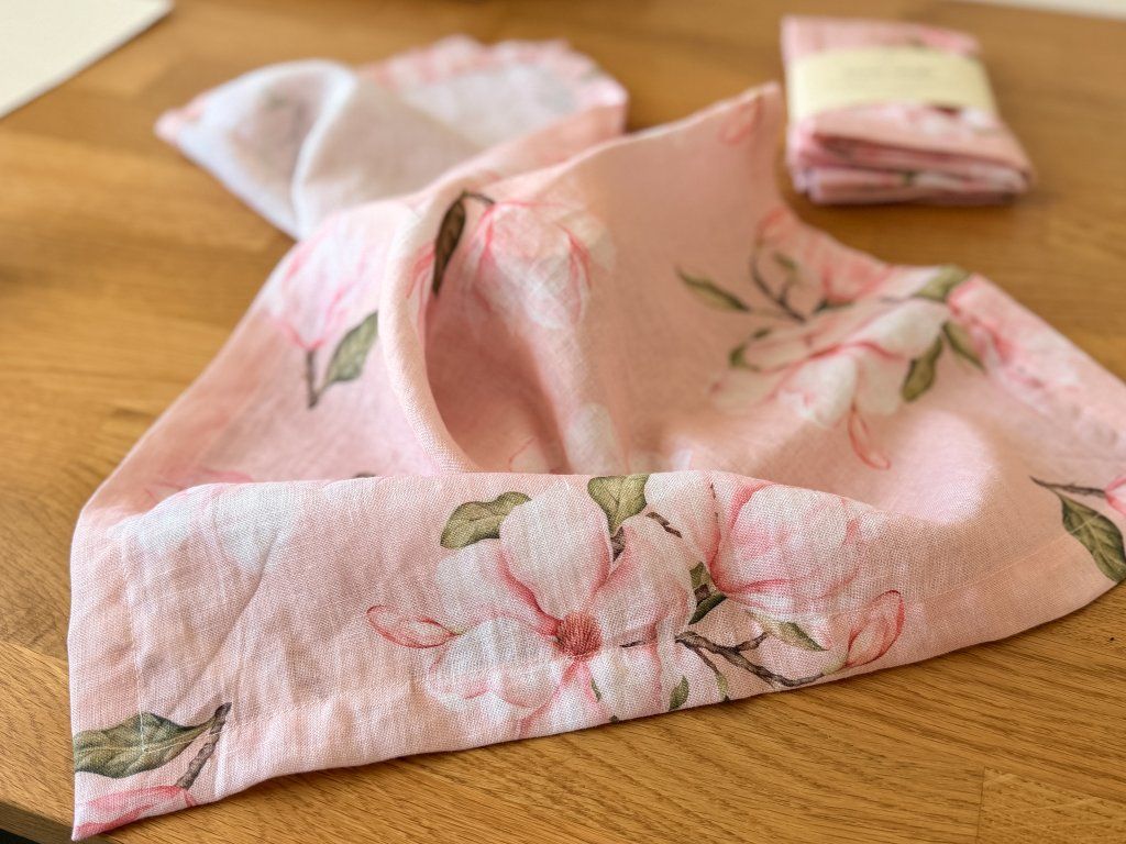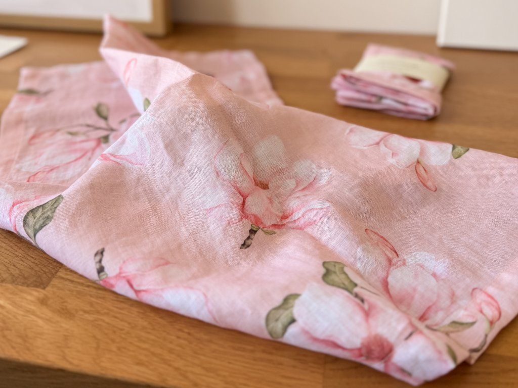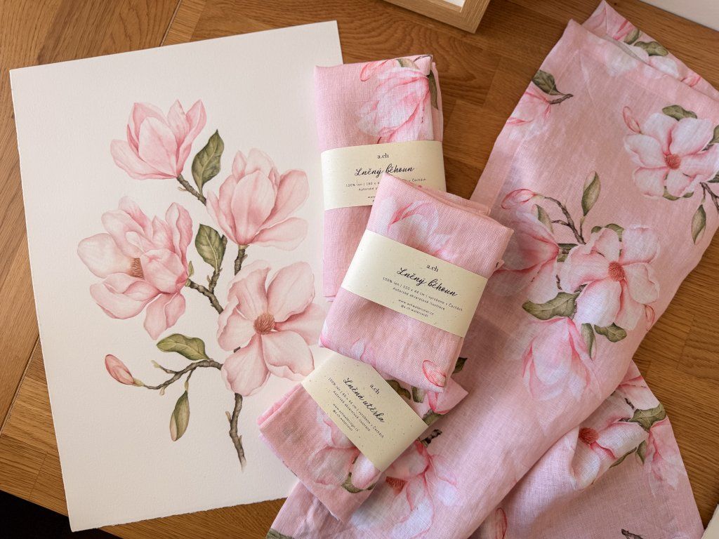 Lněný, udržitelný, funkční, neskutečně příjemný, jednoduše ach! To je lněný ubrus s autorskými akvarelovými ilustracemi magnolie.