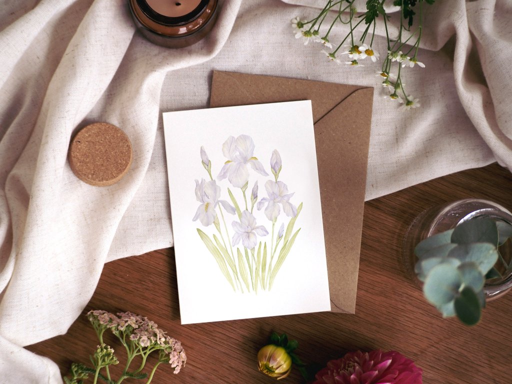 Přáníčko s autorskou akvarelovou ilustrací kosatců. Pošlete originální přání svým blízkým s ilustrací, kterou si pak mohou vystavit.