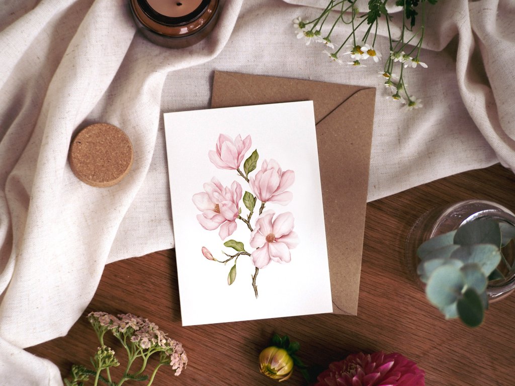 Přáníčko s autorskou akvarelovou ilustrací magnolie. Pošlete originální přání svým blízkým s ilustrací, kterou si pak mohou vystavit.