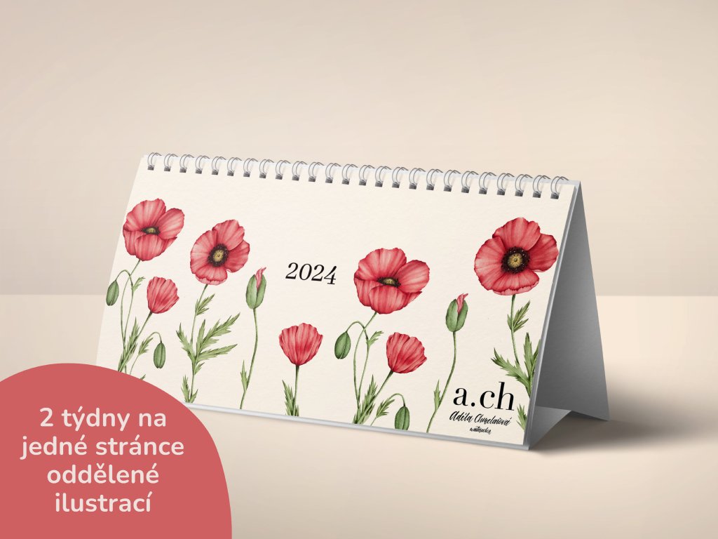 Stolní kalendář pro rok 2024. ✿ 2týdenní kalendář a na každé straně jsou 2 týdny oddělené ilustrací. ✿ Obsahuje české a státní svátky. ✿ Včetně 4 stran pro vaše poznámky. ✿ Prvních 100 kalendářů za výhodnější cenu. ✿ Výroba kalendáře po skončení kampaně. ✿ Dodání přelom říjen/listopad.