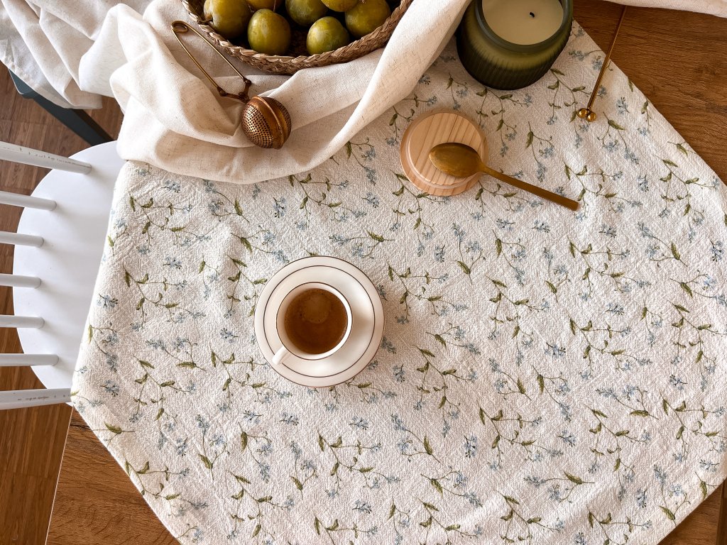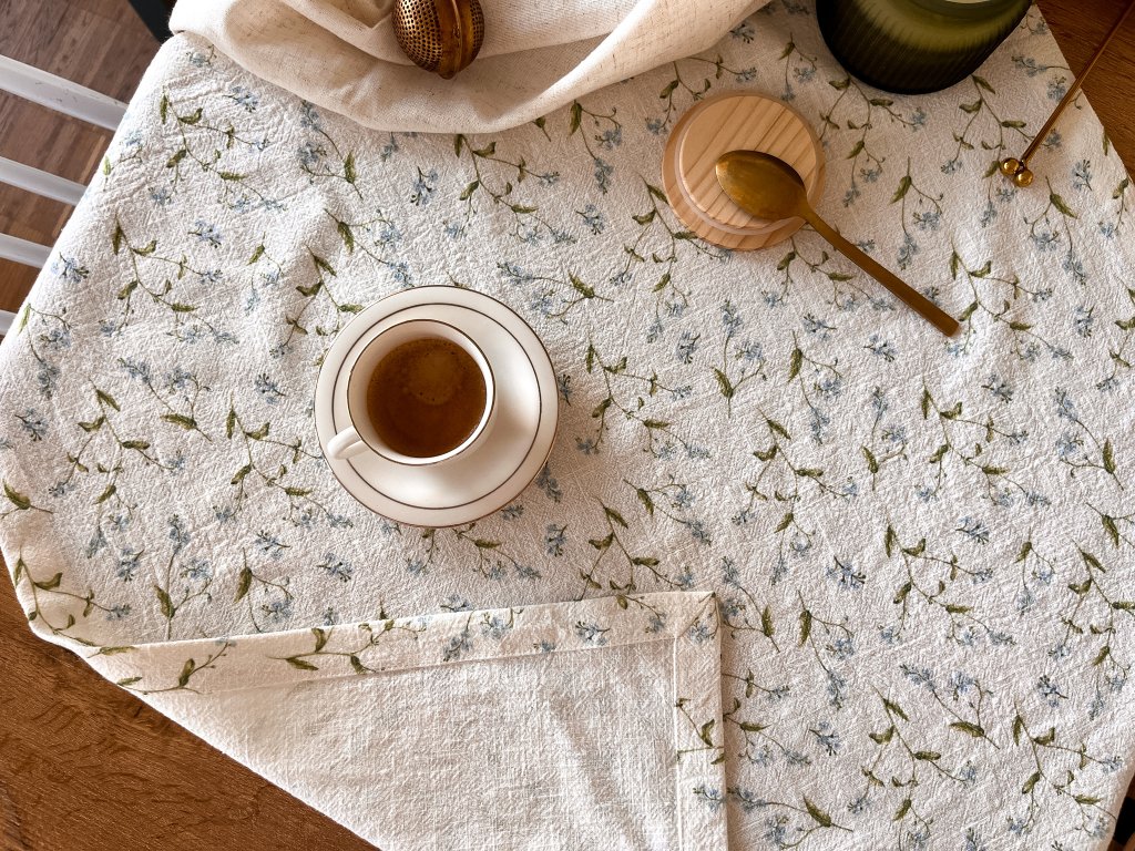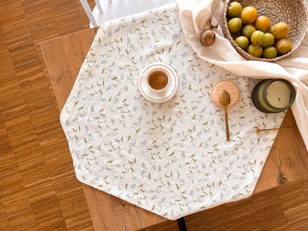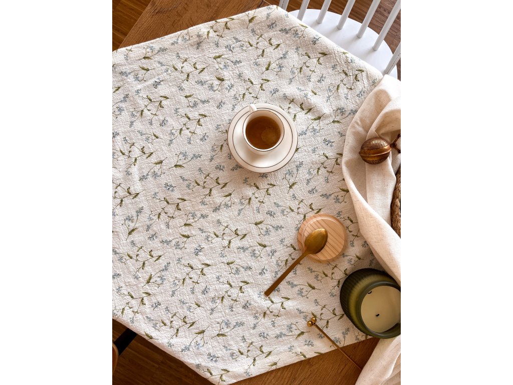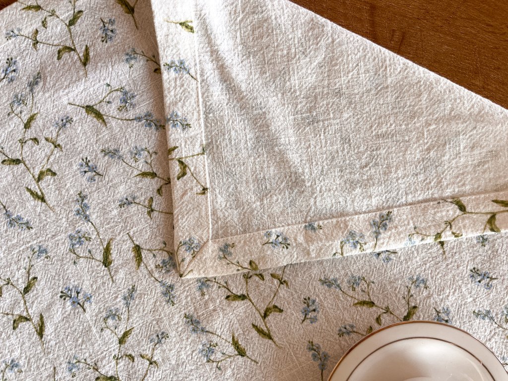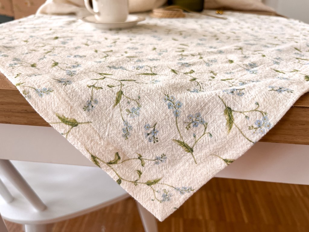 Lněný, udržitelný, funkční, neskutečně příjemný, jednoduše ach! To je lněný běhoun s autorskou akvarelovými ilustracemi pomněnek.