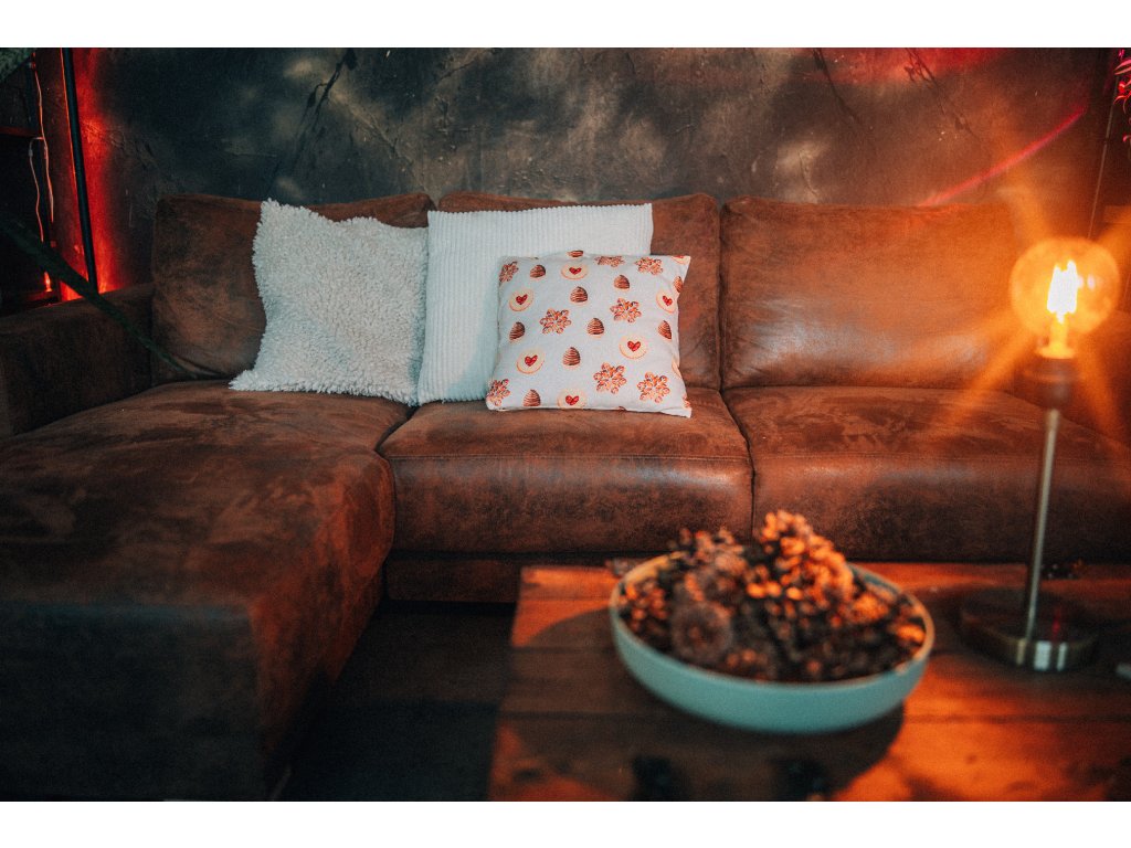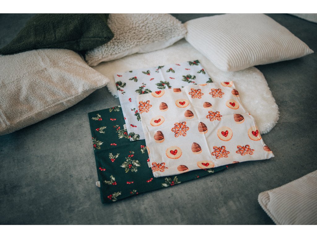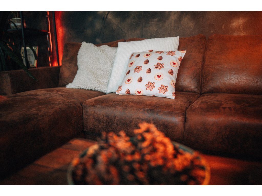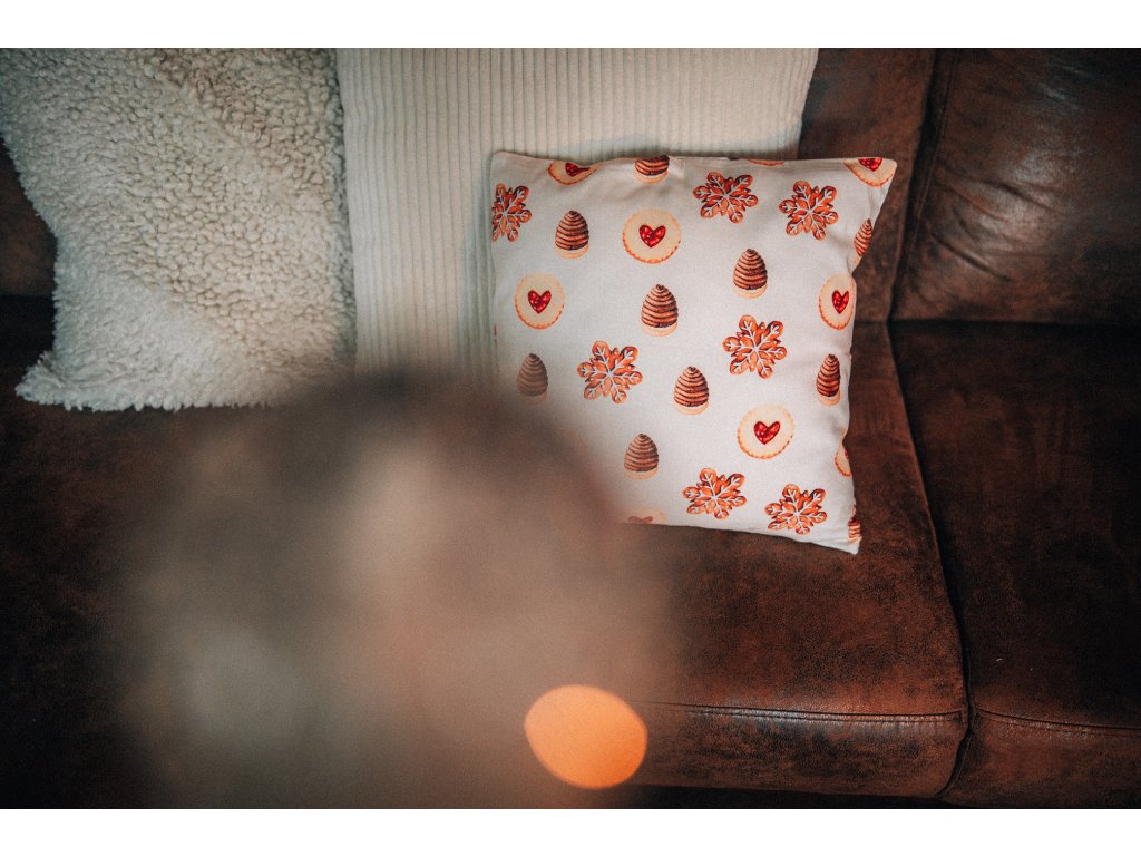 Bavlněný povlak na polštář s autorskou akvarelovou ilustrací cukroví.