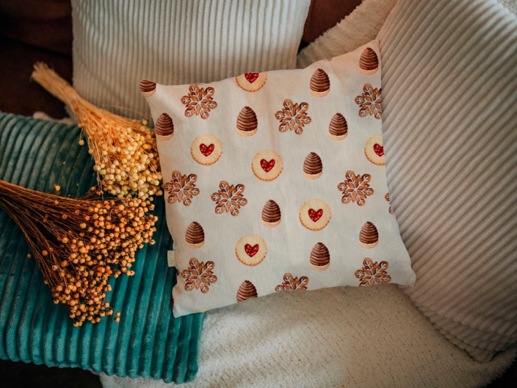 Viskózový povlak na polštář s autorskou akvarelovou ilustrací cukroví.